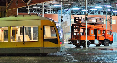 Duas das viaturas de apoio da Carris, aos eléctricos.